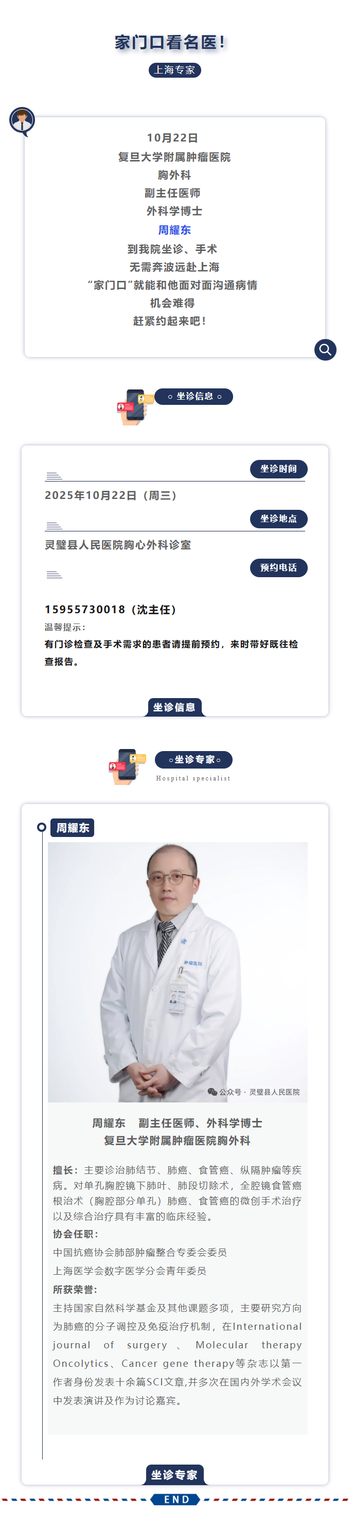 上海名医下沉到县医院!10月22日复旦大学附属肿瘤医院胸外科专家周耀东来我院坐诊、手术