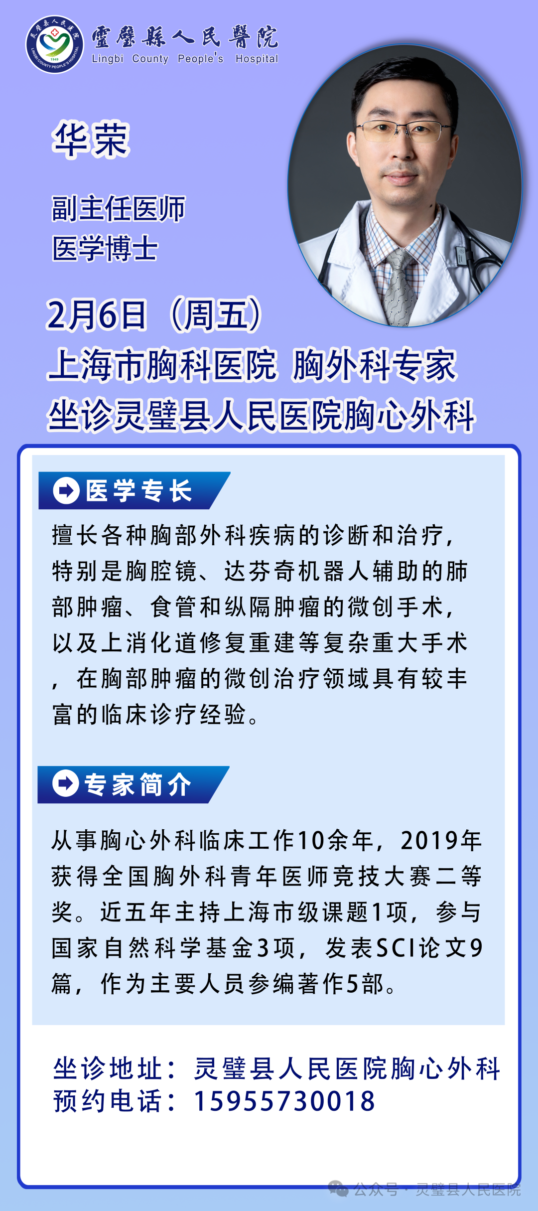 家门口看上海顶尖专家!2 月 6 日,上海胸科医院华荣博士来我院坐诊、手术,预约从速!