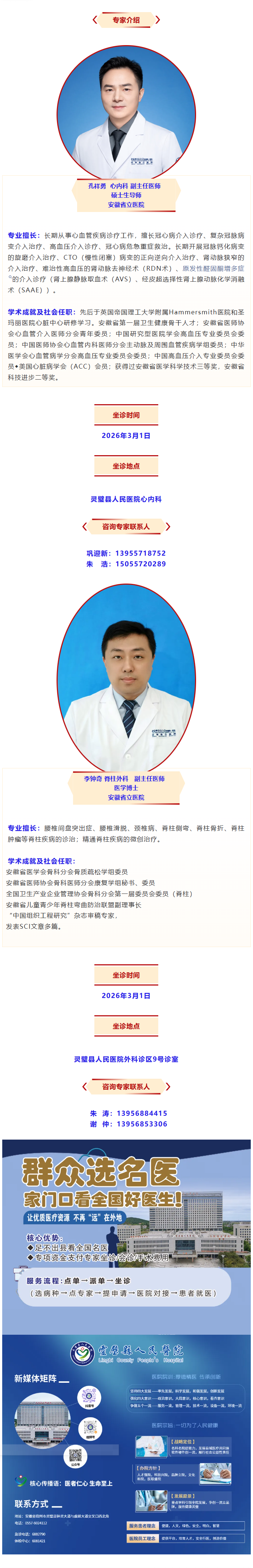 省级专家零距离!3月1日安徽省立医院心内科孔祥勇教授、脊柱外科李钟奇博士来我院开展诊疗服务